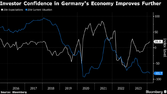 “对德国经济的预期再次改善”,ZEW总裁Achim Wambach在声明中说。“鉴于通胀率在下降,超过三分之二的受访者预计欧洲央行未来六个月将降息。”类似占比的受访者预计美国即将降息。